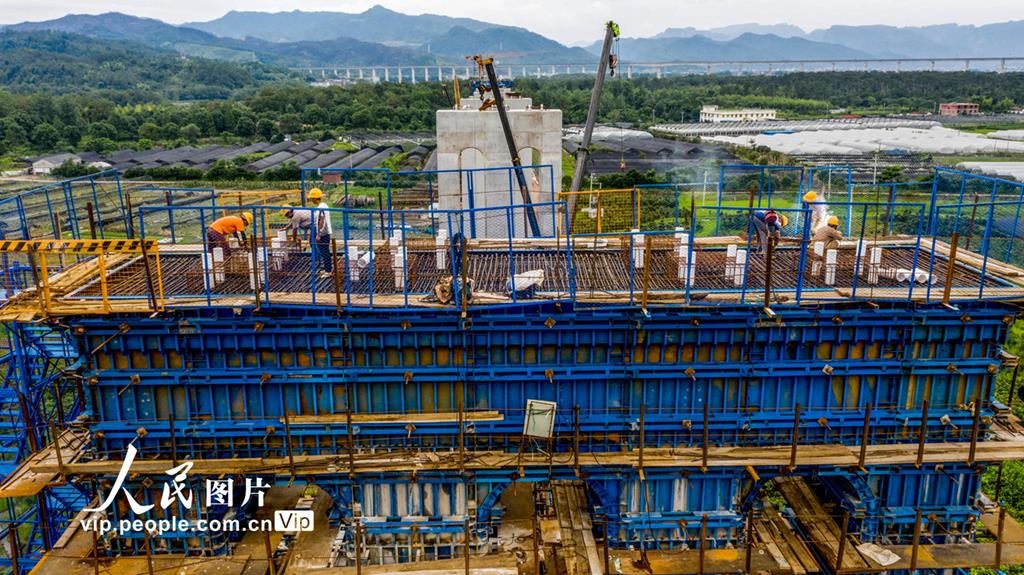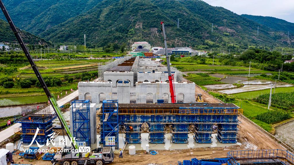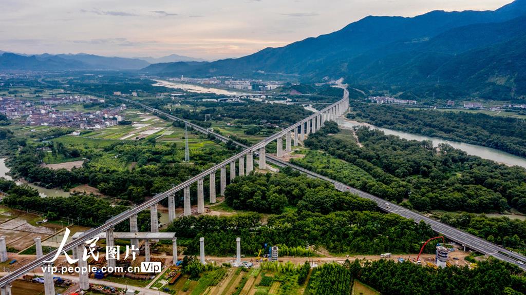 2021年6月14日,杭溫高鐵浙江省臺州市仙居特大橋項目建設現場,中鐵上海工程局工人在進行緊張的橋墩施工。該特大橋是杭溫高鐵重點控制性工程,橋梁總長4418.33米,共有103個橋墩。