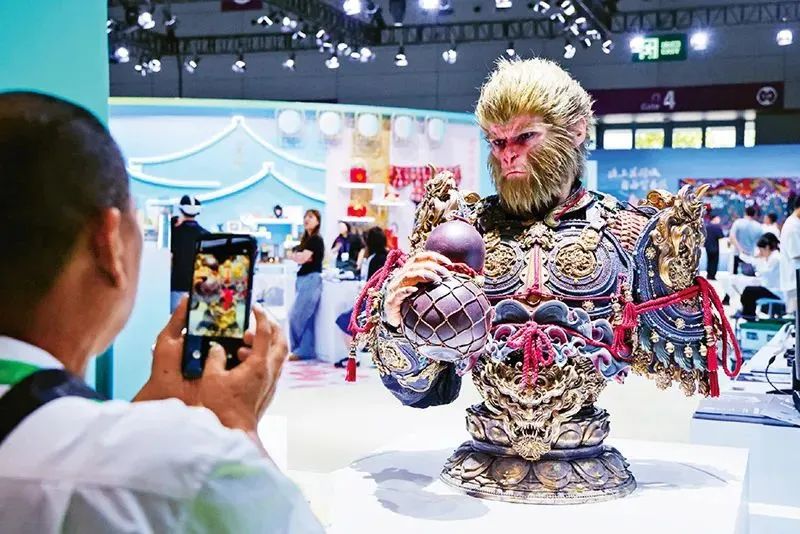 民營經濟是推進中國式現代化的生力軍,是高質量發展的重要基礎。圖為2025年5月23日,在深圳舉行的第二十一屆中國(深圳)國際文化產業博覽交易會上,觀眾在拍攝黑神話悟空半身像。 新華社記者 梁旭/攝